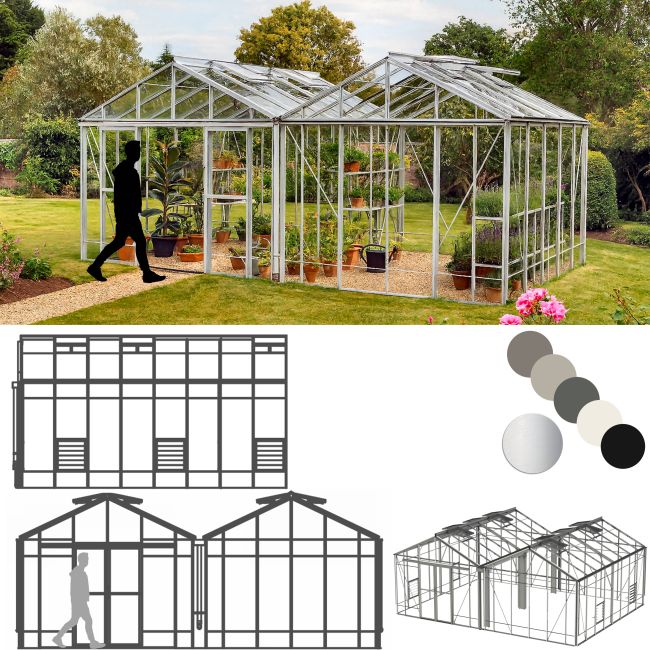 These superb greenhouses have been designed for the enthusiastic grower. Robinsons Rosette Reach Double Span greenhouses are a massive 21ft 9in (6628mm) wide and available in various lengths. They are outstandingly strong and well constructed. The width provides ample growing space. Double doors allow for up to 35in wide greenhouse staging to be positioned both sides. The Rosette Reach features a higher 6ft 6in (1985mm) eaves height and a ground level door threshold allows freedom of movement for garden machinery and wheelbarrows and wheelchairs.