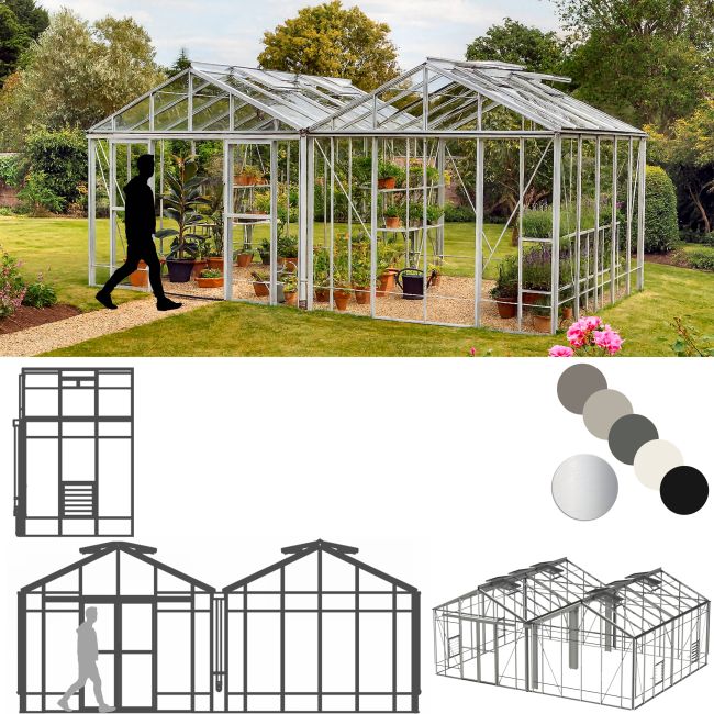These superb greenhouses have been designed for the enthusiastic grower. Robinsons Rosette Reach Double Span greenhouses are a massive 21ft 9in (6628mm) wide and available in various lengths. They are outstandingly strong and well constructed. The width provides ample growing space. Double doors allow for up to 35in wide greenhouse staging to be positioned both sides. The Rosette Reach features a higher 6ft 6in (1985mm) eaves height and a ground level door threshold allows freedom of movement for garden machinery and wheelbarrows and wheelchairs.