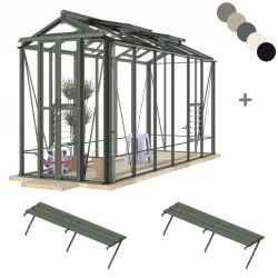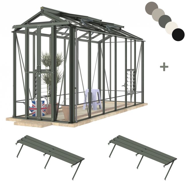 This ULTIMATE PACKAGE Includes 2 No. 3 slat shelves the length of the building - both powder coated & colour matched to your greenhouse