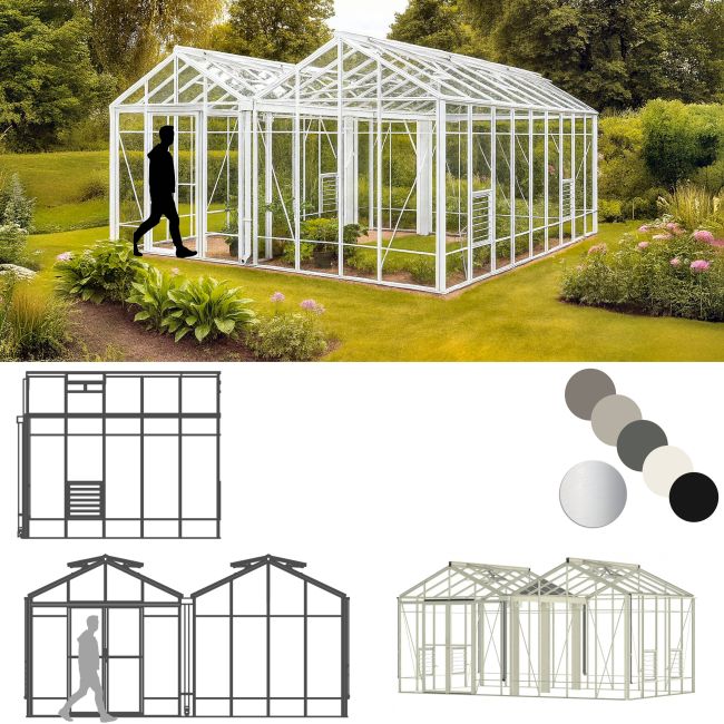 Robinsons Royale Reach Greenhouses are very popular in our professional range. This is double span model is a full 17ft 7in (5368mm) wide and available in various lengths. Double doors are a particular feature of this model, they slide easily, are lockable and provide easy access over the ground level door threshold - ideal for wheelbarrow and wheelchair access. This Royale Reach model has the added benefit of extra high eaves at 6' 6" (1985mm).