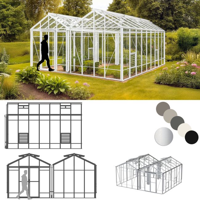 Robinsons Royale Reach Greenhouses are very popular in our professional range. This is double span model is a full 17ft 7in (5368mm) wide and available in various lengths. Double doors are a particular feature of this model, they slide easily, are lockable and provide easy access over the ground level door threshold - ideal for wheelbarrow and wheelchair access. This Royale Reach model has the added benefit of extra high eaves at 6' 6" (1985mm).