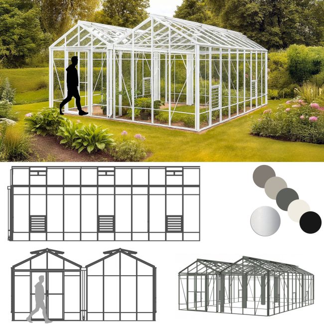 Robinsons Royale Reach Greenhouses are very popular in our professional range. This is double span model is a full 17ft 7in (5368mm) wide and available in various lengths. Double doors are a particular feature of this model, they slide easily, are lockable and provide easy access over the ground level door threshold - ideal for wheelbarrow and wheelchair access. This Royale Reach model has the added benefit of extra high eaves at 6' 6" (1985mm).