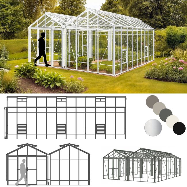 Robinsons Royale Reach Greenhouses are very popular in our professional range. This is double span model is a full 17ft 7in (5368mm) wide and available in various lengths. Double doors are a particular feature of this model, they slide easily, are lockable and provide easy access over the ground level door threshold - ideal for wheelbarrow and wheelchair access. This Royale Reach model has the added benefit of extra high eaves at 6' 6" (1985mm).