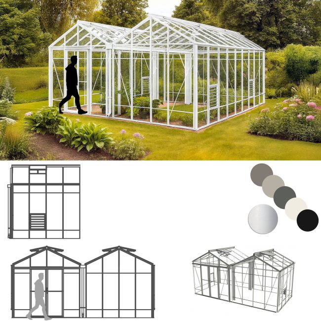 Robinsons Royale Reach Greenhouses are very popular in our professional range. This is double span model is a full 17ft 7in (5368mm) wide and available in various lengths. Double doors are a particular feature of this model, they slide easily, are lockable and provide easy access over the ground level door threshold - ideal for wheelbarrow and wheelchair access. This Royale Reach model has the added benefit of extra high eaves at 6' 6" (1985mm).