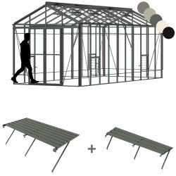 The extra high eaves of 6' 6" give this greenhouse a fantastic atmosphere that gives you and your plants a whole extra foot of headroom over the standard height Royale model. This extra height means that you can position your doors on the end or the side of the greenhouse. You will also have room to place two high level shelves above your staging - considerably increasing your growing capacity.