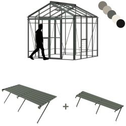 The extra high eaves of 6' 6" give this greenhouse a fantastic atmosphere that gives you and your plants a whole extra foot of headroom over the standard height Royale model. This extra height means that you can position your doors on the end or the side of the greenhouse. You will also have room to place two high level shelves above your staging - considerably increasing your growing capacity.
