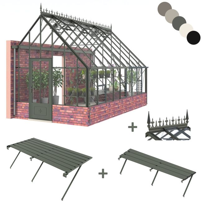 The Roydon ULTIMATE PACKAGE includes full width colour matched staging and shelving across the rear + Victorian ridge cresting and finials in the package price
