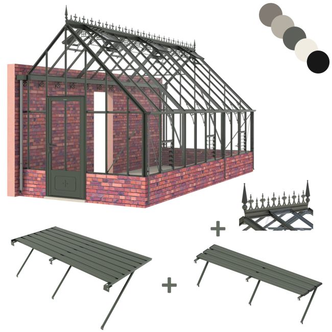 The Roydon ULTIMATE PACKAGE includes full width colour matched staging and shelving across the rear + Victorian ridge cresting and finials in the package price