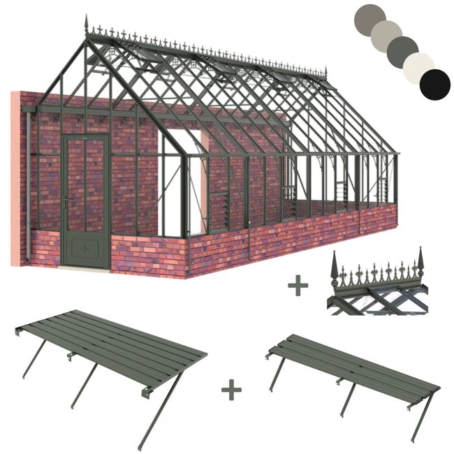 The Roydon ULTIMATE PACKAGE includes full width colour matched staging and shelving across the rear + Victorian ridge cresting and finials in the package price