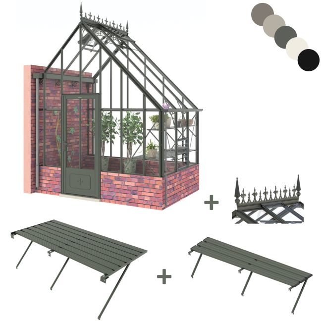 The Roydon ULTIMATE PACKAGE includes full width colour matched staging and shelving across the rear + Victorian ridge cresting and finials in the package price