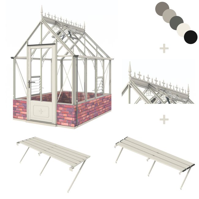 The Rugby ULTIMATE PACKAGE includes full length colour matched staging and shelving down one side + Victorian ridge cresting and finials in the package price