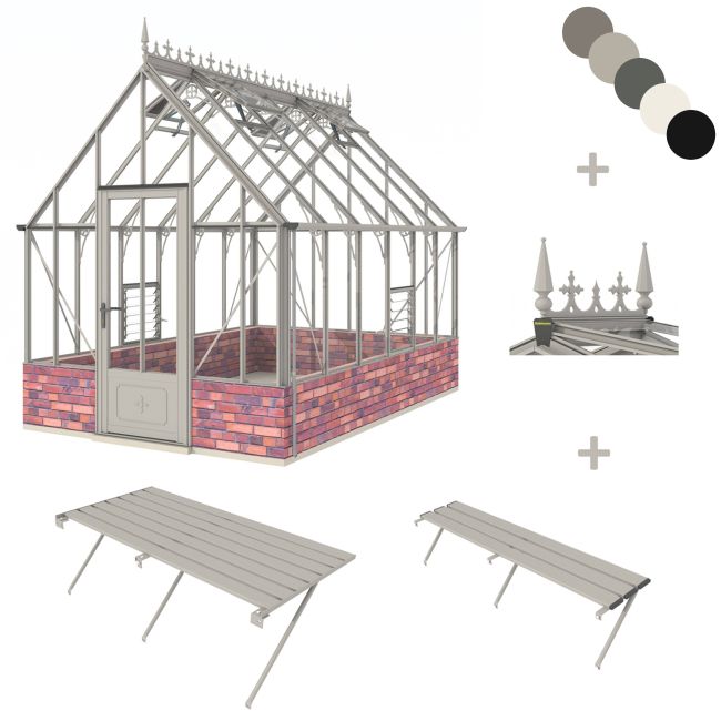 The Rushmoor ULTIMATE PACKAGE includes full length colour matched staging and shelving down one side + Victorian ridge cresting and finials in the package price