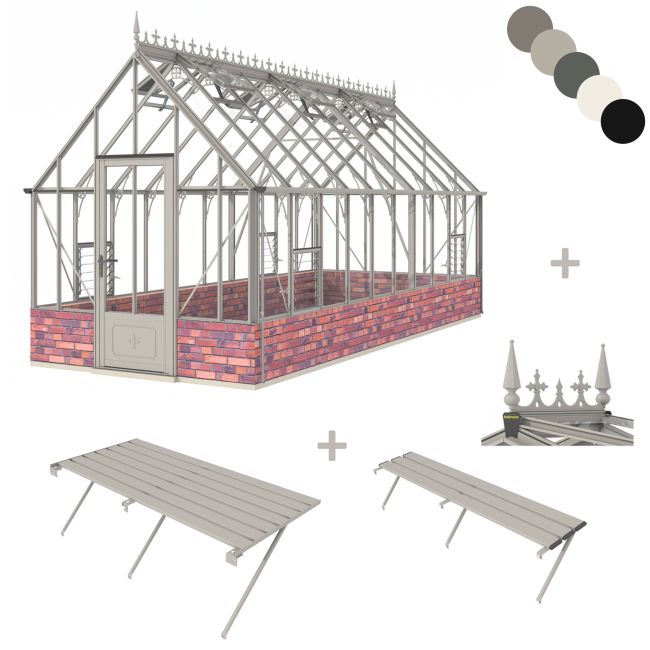The Rushmoor ULTIMATE PACKAGE includes full length colour matched staging and shelving down one side + Victorian ridge cresting and finials in the package price