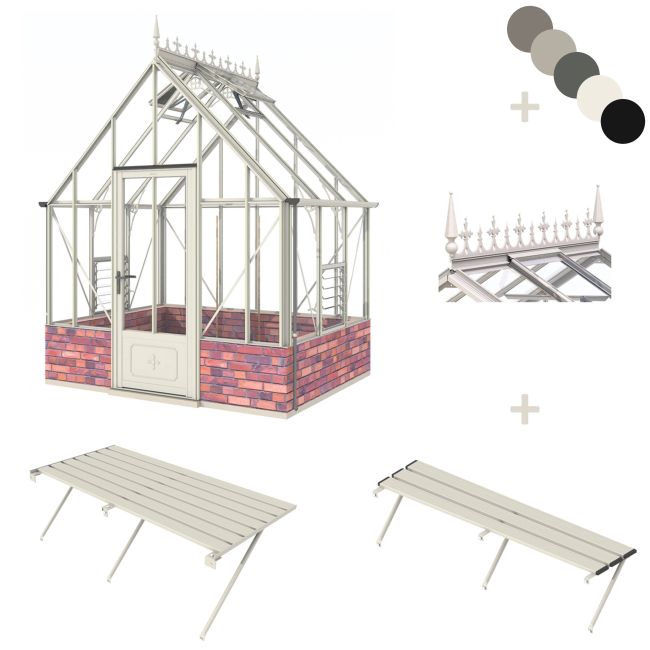 The Rushmoor ULTIMATE PACKAGE includes full length colour matched staging and shelving down one side + Victorian ridge cresting and finials in the package price