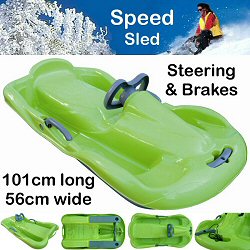 This sturdy PVC snow sledge will give the little ones, and Mum and Dad of course, a great fun time outside in the snow. The sledge is equipped with not only an easy to grip steering wheel that controls the two front ski runners, but also a couple of handbrakes, one left and one right. You can use these to make more severe turns when racing your friends down the slopes, or pull them both to use as a break and slow down. Included is a front mounted pulley cord and handle, which conveniently tucks away inside its own holder. At just over 1 metre long this sledge is designed for children and adults alike. You could get two kids on board as the seat is half the length of the sledge at 50cm. There is a little back rest built in to stop you sliding off and the overall quality of the sledge is superb, well made and very sturdy.