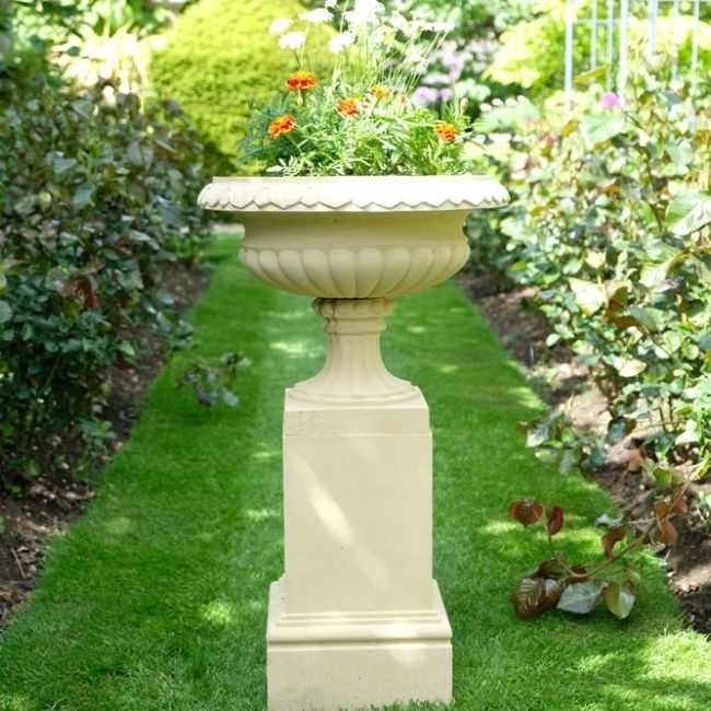 The Regency Pedestal is a classic design for use with a variety of urns and vases such as the Shugborough Vase or the Regency Urn (pictured).