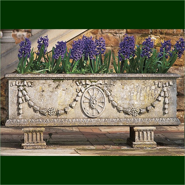 The Adam-style trough adorned with festoons and medallions, is ideal for decorating terraces or porches.