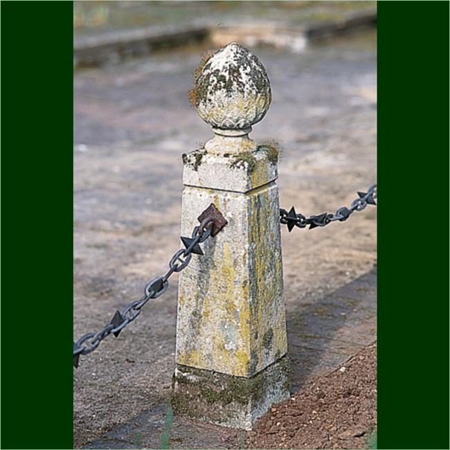 The bollard surmounted by a fircone finial may be used with or without connecting chains (not supplied).
