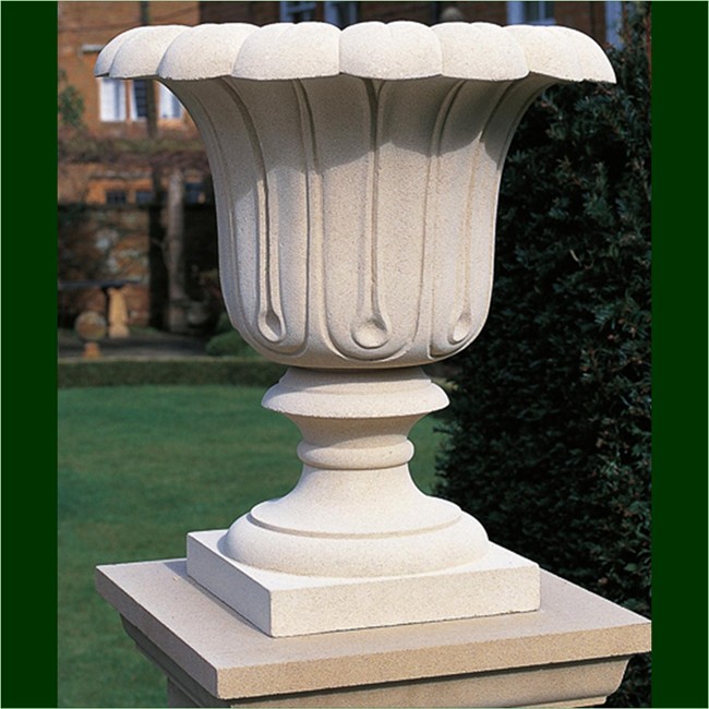 A small campana-shaped vase featuring a stylised leaf design. The Croyland vase if part an extensive range of cast stone garden ornaments replicated from an original planter in a private Northamptonshire garden.