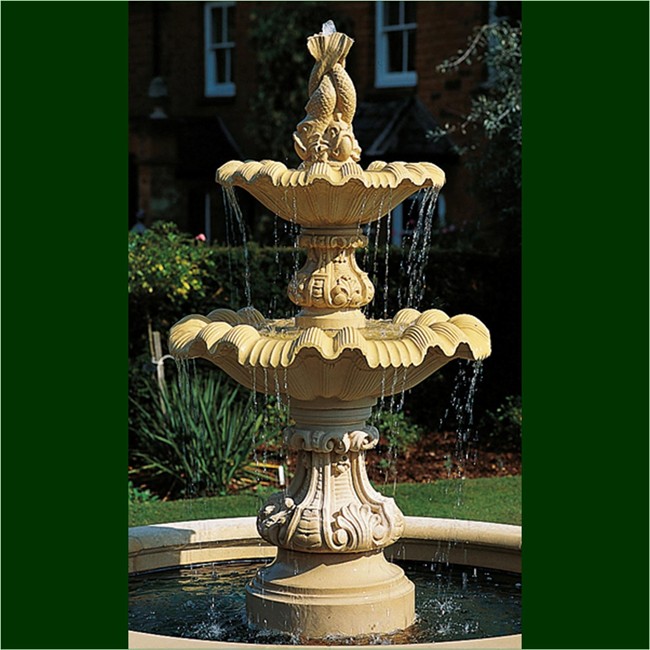A large double fountain with ornate shell bowls and pedestals supporting an entwined triple-dolphin centrepiece.