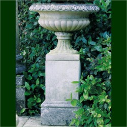 The small urn with leaf moulding around the rim and fluted base is shown on a simple pedestal with plain moulding. Alternatively the urn can be used as a decorative feature to enhance balustrading.
