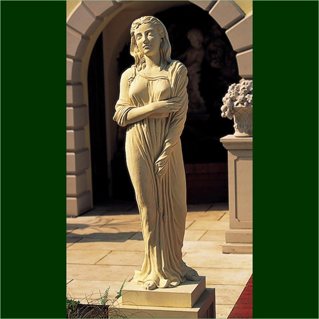 The is series of statues depicting the Seasons. Spring stands demurely holding a sprig of pussy willow in her right hand, Summer stands gracefully holding a sheaf of corn in her hand, Autumn is depicted holding freshly harvested grapes within her skirts, whilst Winter stands with oak entwined hair and her left arm warmly wrapped with drapery.