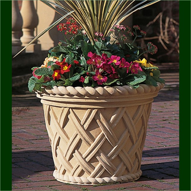 An interwoven strapwork design with rope decoration around the rim and foot. This jardiniere is designed for placing on walls and piers as well as at ground level.