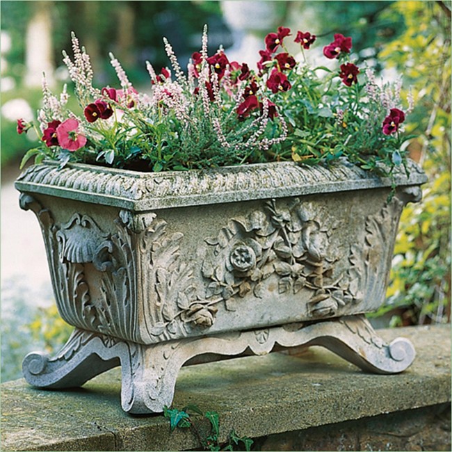 The design of this charming rectangular trough taken from a Vicenza stone original is embellished with festoons of ribbon-tied roses and acanthus leaves with gadrooning to the rim. Suitable for a conservatory or garden room.