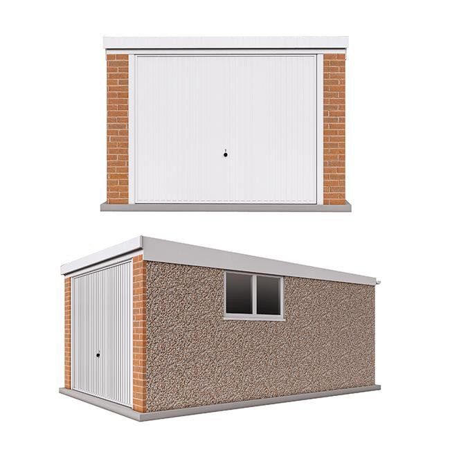 The Ultimate range of garages has been designed to give maintenance free service, with superb white powder coated up and over doors(s), 4ft wide double glazed fixed PVCu window, white headboard, side fascia boards, guttering and down pipe all in the finest quality, maintenance free PVCu. The front aspect is finished with genuine brick (Red Wire cut) pillars either side of the front up and over door. A steel personal door is also included. All Pent roof garages have corrugated ultra-steel sheets with a new anti-condensation, no noise coated steel roof sheet on purpose made welded steel trusses. All Apex roof garages have corrugated cement fibre roofing sheets. The roof pitch of all the Ultimate Apex garages is 12.5 degrees, to accommodate the attractive ridge tiles, this is a lower pitch than the standard range of garages & gives a less pointed appearance. The walls are concrete panels, machine vibrated and re-enforced with steel mats to give maximum strength. The exterior finish is hard wearing and maintenance free Canterbury Spa Stone. All panel joints are sealed with natural colour mastic.