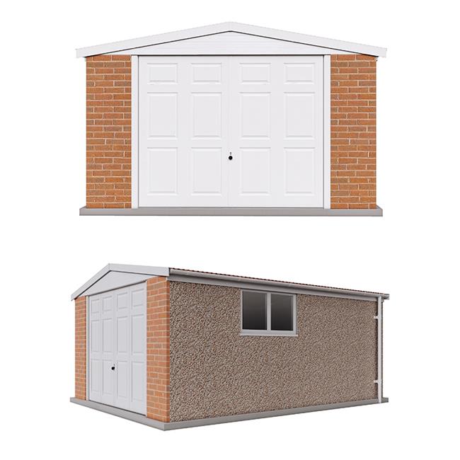 The Ultimate range of garages has been designed to give maintenance free service, with superb white powder coated up and over doors(s), 4ft wide double glazed fixed PVCu window, white headboard, side fascia boards, guttering and down pipe all in the finest quality, maintenance free PVCu. The front aspect is finished with genuine brick (Red Wire cut) pillars either side of the front up and over door. A steel personal door is also included. All Pent roof garages have corrugated ultra-steel sheets with a new anti-condensation, no noise coated steel roof sheet on purpose made welded steel trusses. All Apex roof garages have corrugated cement fibre roofing sheets. The roof pitch of all the Ultimate Apex garages is 12.5 degrees, to accommodate the attractive ridge tiles, this is a lower pitch than the standard range of garages & gives a less pointed appearance. The walls are concrete panels, machine vibrated and re-enforced with steel mats to give maximum strength. The exterior finish is hard wearing and maintenance free Canterbury Spa Stone. All panel joints are sealed with natural colour mastic.