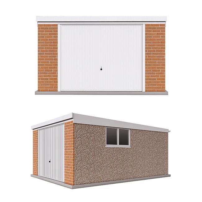The Ultimate range of garages has been designed to give maintenance free service, with superb white powder coated up and over doors(s), 4ft wide double glazed fixed PVCu window, white headboard, side fascia boards, guttering and down pipe all in the finest quality, maintenance free PVCu. The front aspect is finished with genuine brick (Red Wire cut) pillars either side of the front up and over door. A steel personal door is also included. All Pent roof garages have corrugated ultra-steel sheets with a new anti-condensation, no noise coated steel roof sheet on purpose made welded steel trusses. All Apex roof garages have corrugated cement fibre roofing sheets. The roof pitch of all the Ultimate Apex garages is 12.5 degrees, to accommodate the attractive ridge tiles, this is a lower pitch than the standard range of garages & gives a less pointed appearance. The walls are concrete panels, machine vibrated and re-enforced with steel mats to give maximum strength. The exterior finish is hard wearing and maintenance free Canterbury Spa Stone. All panel joints are sealed with natural colour mastic.