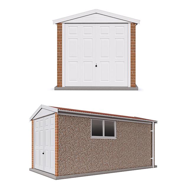 The Ultimate range of garages has been designed to give maintenance free service, with superb white powder coated up and over doors(s), 4ft wide double glazed fixed PVCu window, white headboard, side fascia boards, guttering and down pipe all in the finest quality, maintenance free PVCu. The front aspect is finished with genuine brick (Red Wire cut) pillars either side of the front up and over door. A steel personal door is also included. All Pent roof garages have corrugated ultra-steel sheets with a new anti-condensation, no noise coated steel roof sheet on purpose made welded steel trusses. All Apex roof garages have corrugated cement fibre roofing sheets. The roof pitch of all the Ultimate Apex garages is 12.5 degrees, to accommodate the attractive ridge tiles, this is a lower pitch than the standard range of garages & gives a less pointed appearance. The walls are concrete panels, machine vibrated and re-enforced with steel mats to give maximum strength. The exterior finish is hard wearing and maintenance free Canterbury Spa Stone. All panel joints are sealed with natural colour mastic.