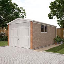 The Ultimate range of garages has been designed to give maintenance free service, with superb white powder coated up and over doors(s), 4ft wide double glazed fixed PVCu window, white headboard, side fascia boards, guttering and down pipe all in the finest quality, maintenance free PVCu. The front aspect is finished with genuine brick (Red Wire cut) pillars either side of the front up and over door. A steel personal door is also included. All Pent roof garages have corrugated ultra-steel sheets with a new anti-condensation, no noise coated steel roof sheet on purpose made welded steel trusses. All Apex roof garages have corrugated cement fibre roofing sheets. The roof pitch of all the Ultimate Apex garages is 12.5 degrees, to accommodate the attractive ridge tiles, this is a lower pitch than the standard range of garages & gives a less pointed appearance. The walls are concrete panels, machine vibrated and re-enforced with steel mats to give maximum strength. The exterior finish is hard wearing and maintenance free Canterbury Spa Stone. All panel joints are sealed with natural colour mastic.