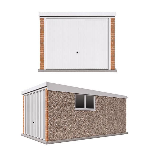 The Ultimate range of garages has been designed to give maintenance free service, with superb white powder coated up and over doors(s), 4ft wide double glazed fixed PVCu window, white headboard, side fascia boards, guttering and down pipe all in the finest quality, maintenance free PVCu. The front aspect is finished with genuine brick (Red Wire cut) pillars either side of the front up and over door. A steel personal door is also included. All Pent roof garages have corrugated ultra-steel sheets with a new anti-condensation, no noise coated steel roof sheet on purpose made welded steel trusses. All Apex roof garages have corrugated cement fibre roofing sheets. The roof pitch of all the Ultimate Apex garages is 12.5 degrees, to accommodate the attractive ridge tiles, this is a lower pitch than the standard range of garages & gives a less pointed appearance. The walls are concrete panels, machine vibrated and re-enforced with steel mats to give maximum strength. The exterior finish is hard wearing and maintenance free Canterbury Spa Stone. All panel joints are sealed with natural colour mastic.