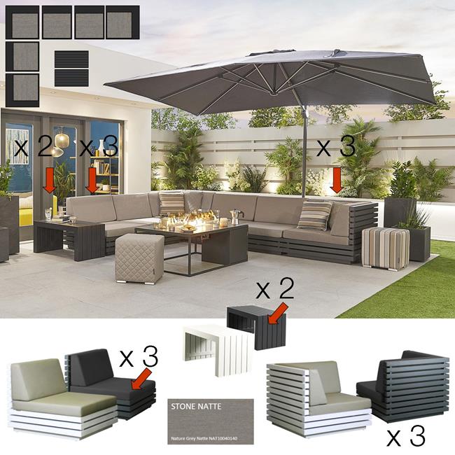 SET INCLUDES: 3 Corners / End Units | 3 Middle Units | 2 Design Coffee Tables Aluminium Frames In CHARCOAL Finish And the Amazing Sunbrella WATERPROOF Leave-Out-Upholstery Frame Colour: Charcoal | With Stone Natte’ Fabric