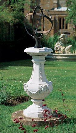 A sundial makes a useful vertical emphasis in a garden design. You may need only one such feature as a focus for your entire plan. This octagonal sundial plinth in the style of Robert Adam is decorated with masks and margents of husks and provides an elegant support for the Armillary Sphere sundial.