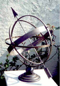 Armillary Spheres are models of the celestial sphere based on the Ptolemy theory of the universe with the earth being stationary at the centre. The celestial sphere is imagined as a sphere with the stars fixed onto its interior and the earth at its centre. Although we now know this to be inaccurate, it does not effect the working of the Armillary Sphere since to an observer on Earth the motion of the Sun and Stars appears the same.