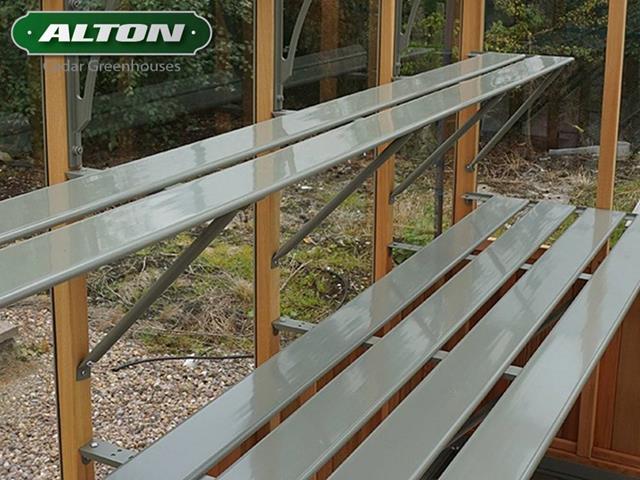 Purpose built to fit your Alton Cedar Greenhouse. This strong staging & shelving is made from aluminium & powder coated in a moss green finish. The staging is available in a choice of 20" wide (3 slat) and 25" wide (4 slat) with high level 11" wide (2 slat) shelving in as long as you wish. Easy assembly with brackets & fixings included.