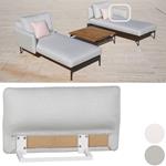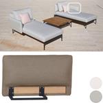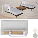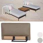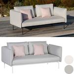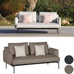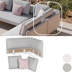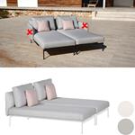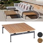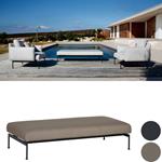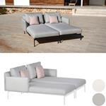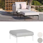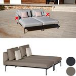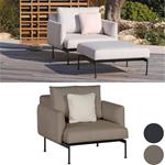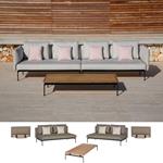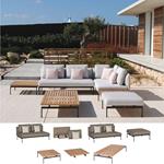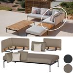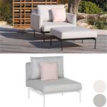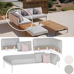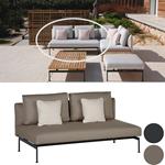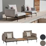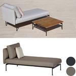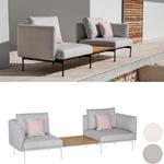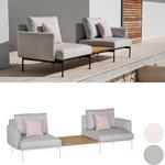 The collection comprises two sizes of upholstered seat (Single & Double Seat widths) and five tables, which together make possible intimate or grand seating corner groups, "L" or "C" Shaped outdoor lounge areas. Upholstered backs and arms are separate components and can fit on any side of the seating units to create sofas, corner sectionals, loungers, chairs, ottomans and many asymmetric configurations. The "Sunbrella" upholstered seats and teak tables use a refined frame made from stainless steel that is then powder coated in a choice of two colours Forge Grey or Arctic White.