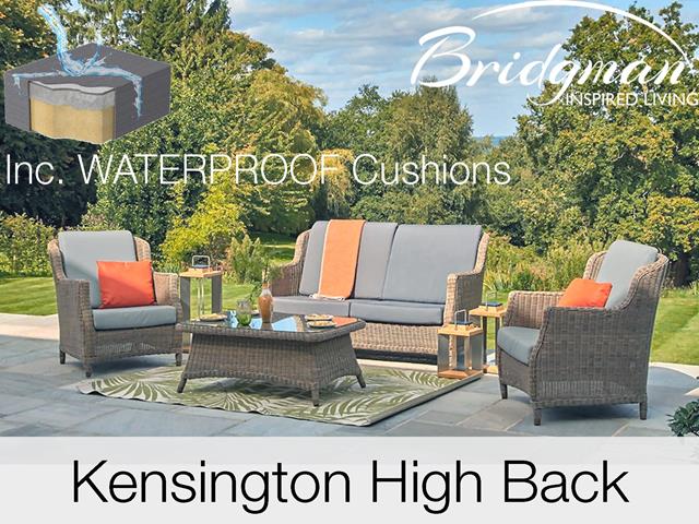 The Bridgman Kensington range HIGH BACK LOUNGE garden furniture is manufactured using the finest materials available in the woven garden furniture market. All weather synthetic rattan weave & powder coated aluminium frames, Kensington includes sumptuous WATERPROOF cushions, which can remain outside for the whole year. So your outdoor lounge is always ready to use.
