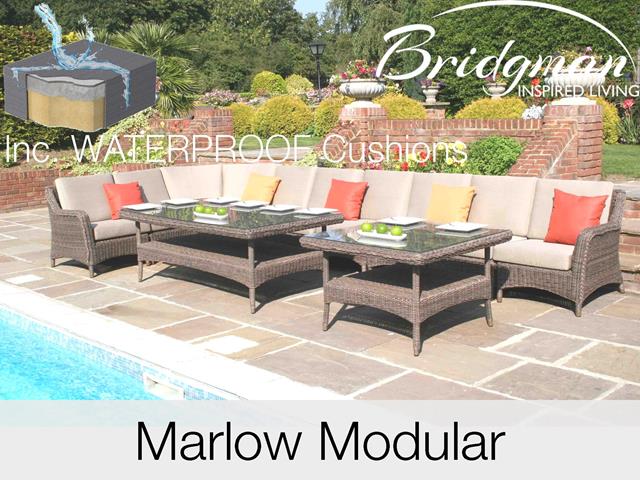 The Bridgman MARLOW MODULAR LOUNGE range of garden furniture is manufactured using the finest materials available in the woven garden furniture market. All weather synthetic rattan weave & powder coated aluminium frames, Marlow includes sumptuous WATERPROOF cushions, which can remain outside for the whole year. So your outdoor lounge is always ready to use.