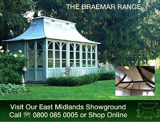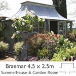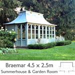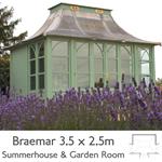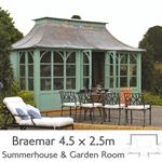 HSP Garden Buildings. An elegant rectangular design, the Braemar Summerhouse incorporates an Edwardian feel, with form and function paramount. Glazed across its entire frontage and part to its sides, it offers both panoramic views and excellent internal lighting qualities. A ventilated top box incorporating low voltage down-lighting provides both comfort when the weather is hot, and subtle lighting in late evening. In addition to double opening doors along its front, glazed panels at each end also open fully allowing the breeze to flow throughout the building. An option to insulate the building adds the possibility to turn the Braemar "Summerhouse" into a year round structure; an office, design studio or simple retreat perhaps; and our extensive range of colour options should fit most surroundings perfectly.
